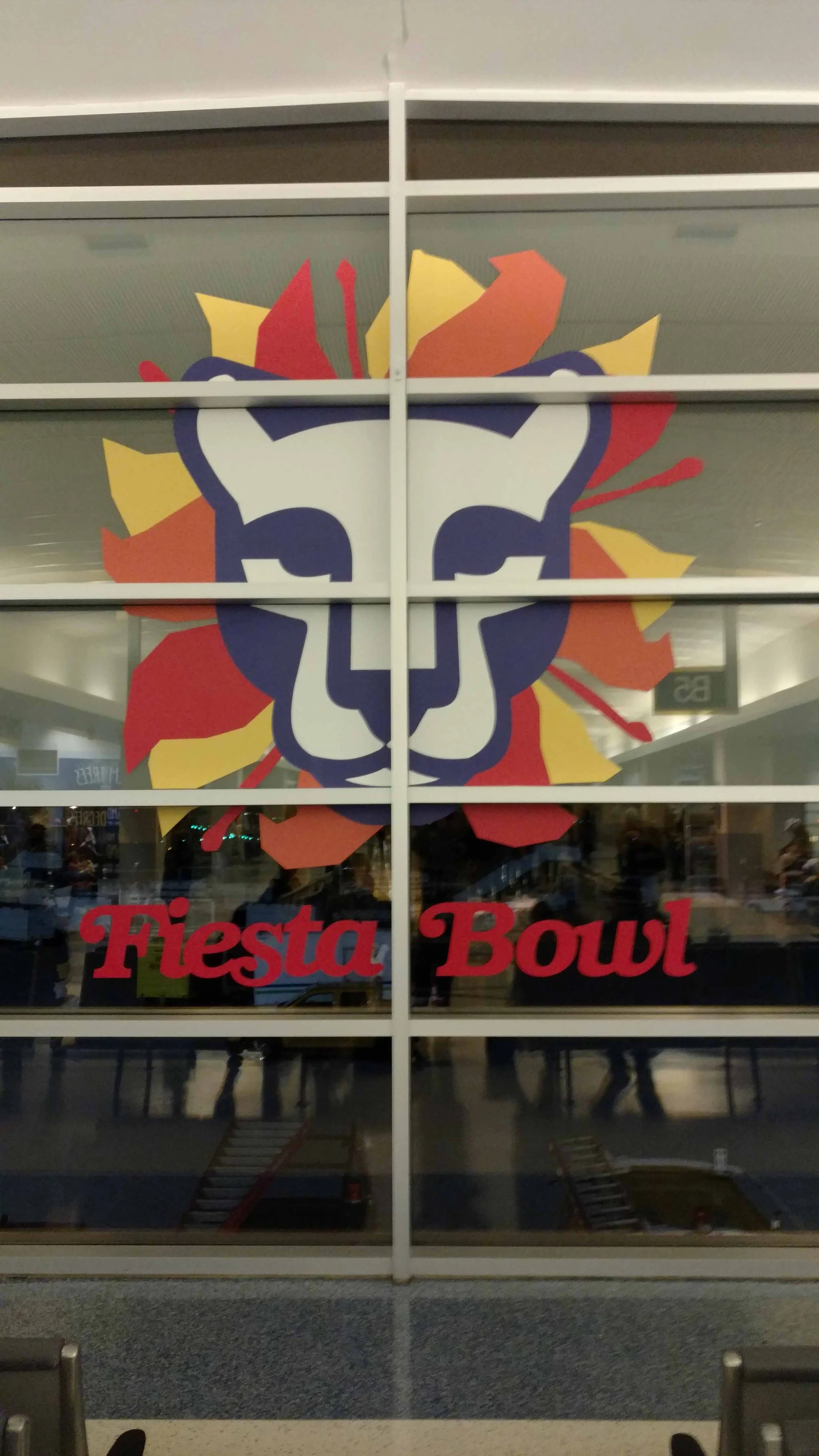 Despite never technically being an “official” Penn State logo, the Pozniak Lion was seen on very official-looking PSU traffic signs guiding drivers to the Beaver Stadium area for a period of several years beginning in the mid-70’s (see photo from 1978 above). Penn State cheerleaders wore the logo on some of their outfits in this same timeframe (see photo below) and Nittany Lion football players wore navy blue blazers with this logo on the 1979 Sugar Bowl trip. Circa 1975, the Penn State Athletic Department raised funds by selling Pozniak Lion art in the form of engravings and needlepoint via brochures enclosed with football ticket offers. If you have travelled on some of the bowl trips with Penn State, you will also have seen this logo at Harrisburg’s airport promoting its connection with the official Alumni Association/Nittany Lion Club Bowl Tours (2017 Rose, 2017 Fiesta, etc.-see below). But, unlike the long-running oval lion head logo that followed it, the Pozniak Lion never appeared on Penn State football uniforms or helmets.